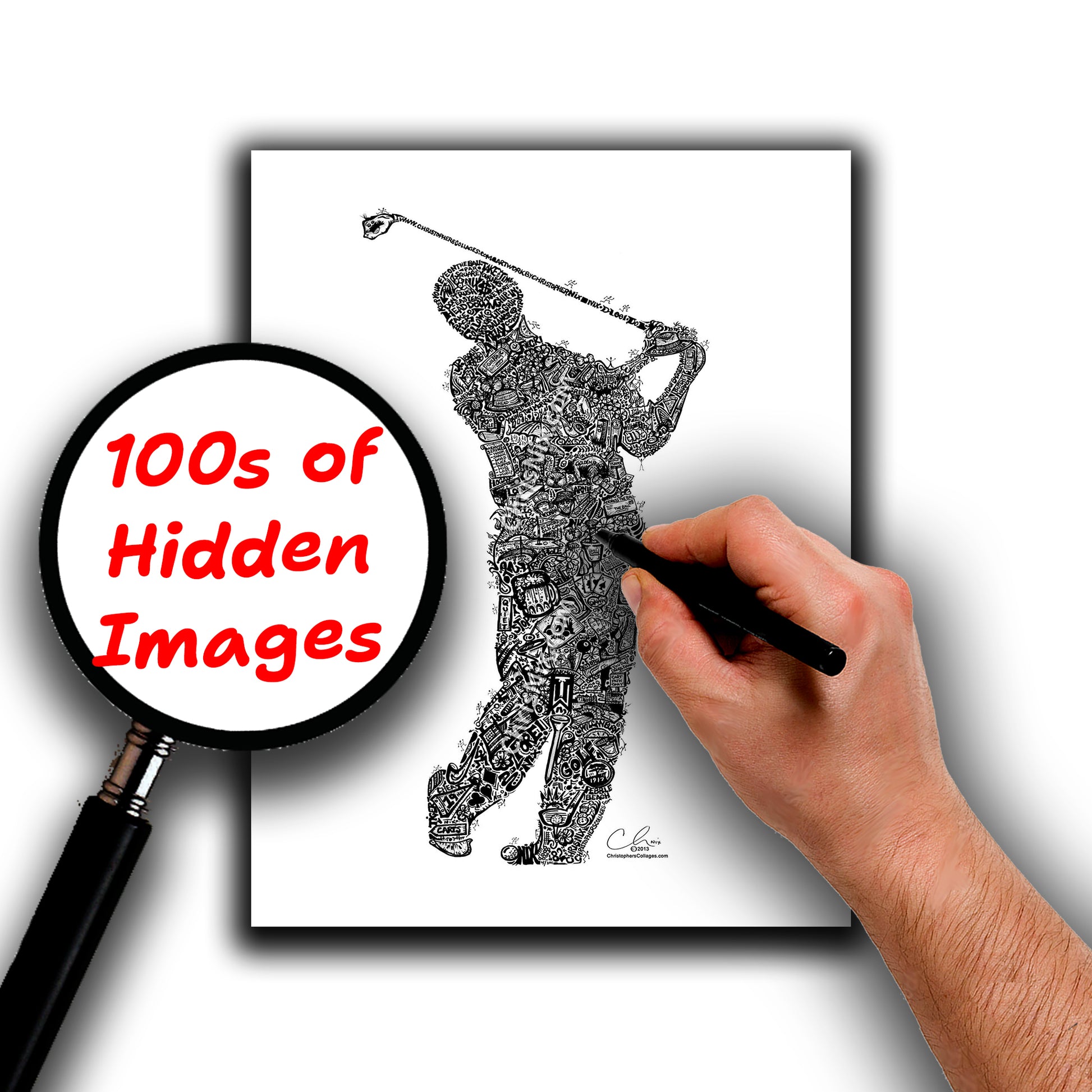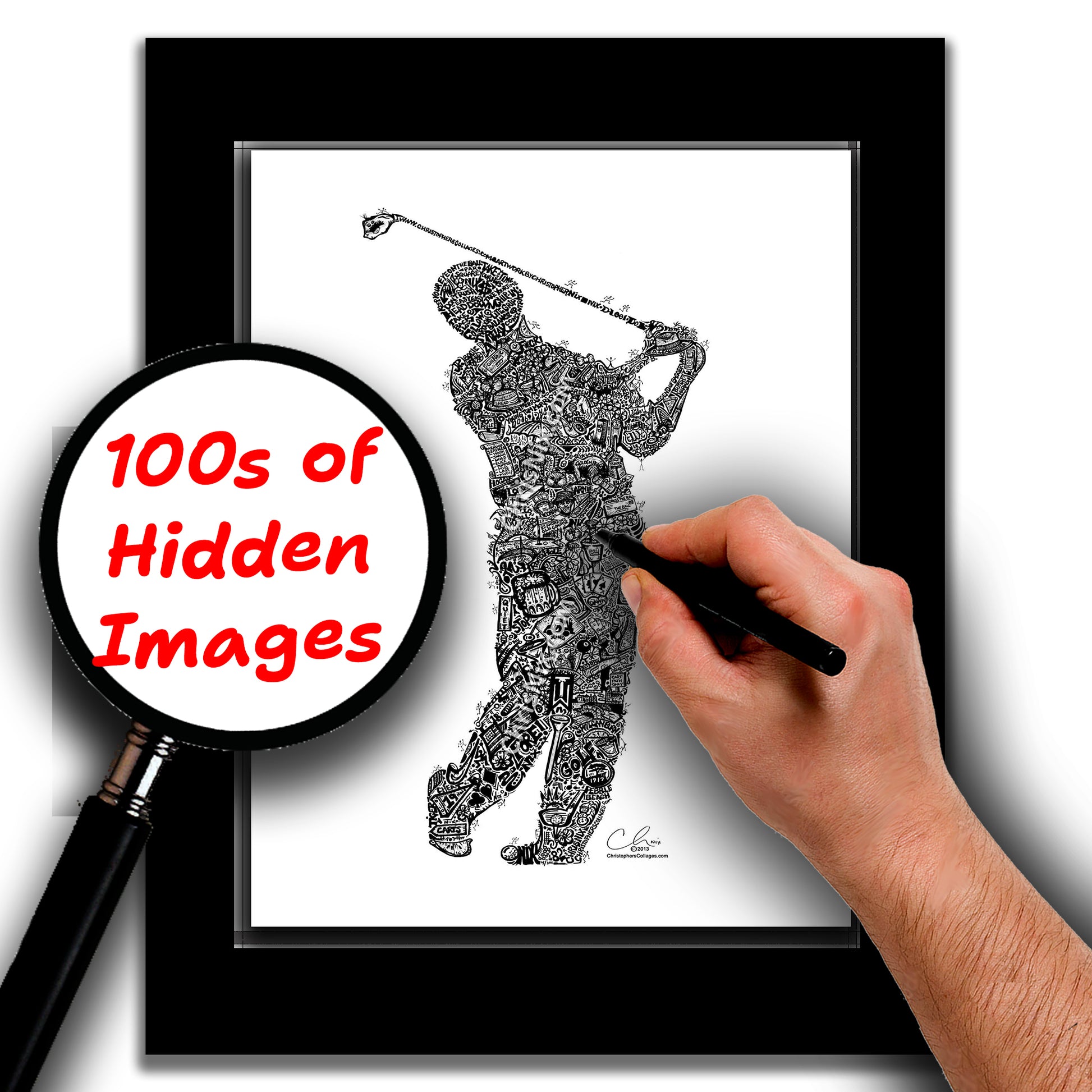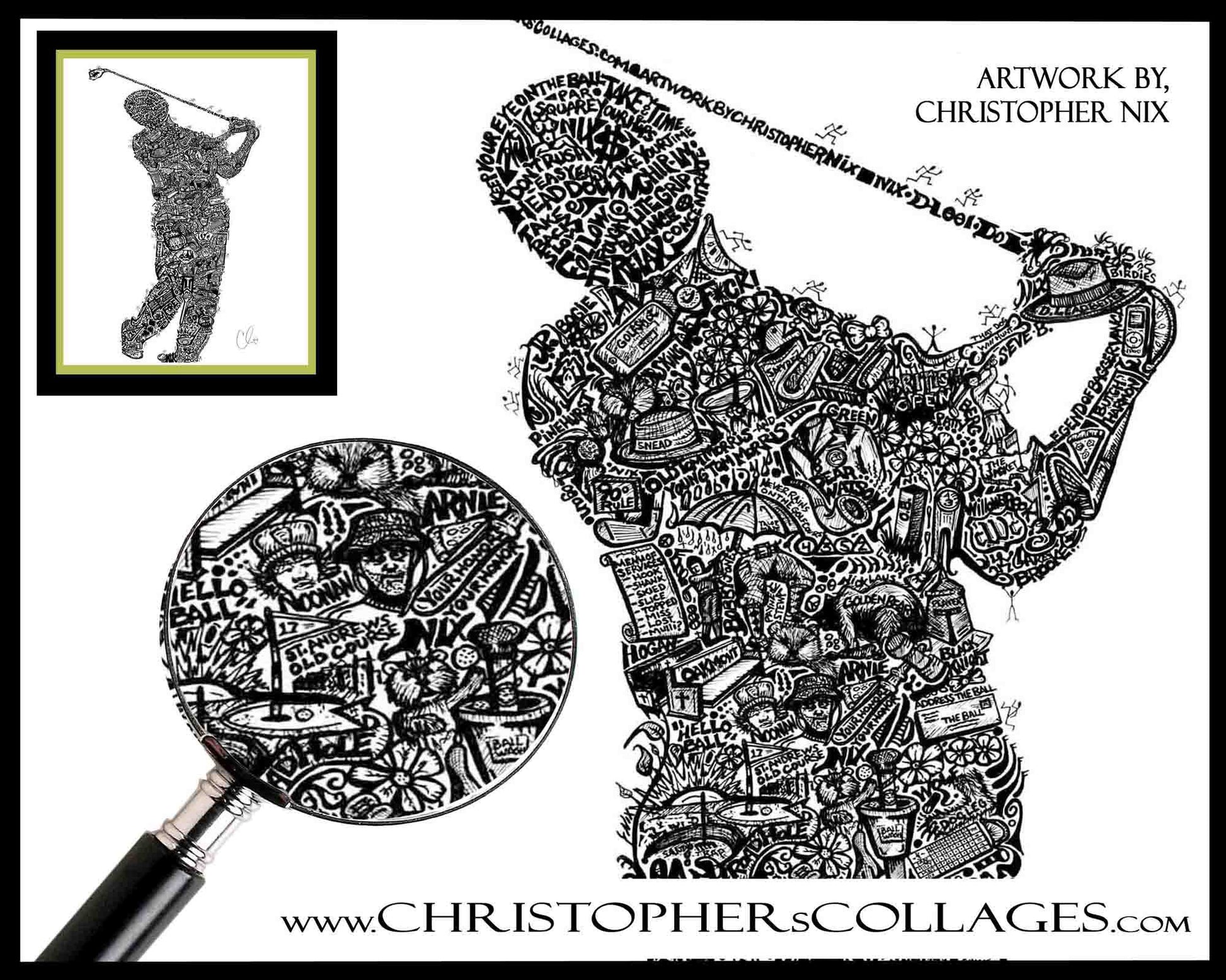 This print titled, “Everything Golf” was created as a tribute to my favorite game, golf. With close to 82 hours of drawing time this piece is my tribute to springtime and to all of us who can’t wait to hit the greens! After a long hard winter, it’s finally time to get outside and play. Like so many, I truly enjoy the challenge and fun of a good golf game, and I wanted to capture some of the history and those who have made this sport larger than life. As you look through the hundreds of images within this piece you will also see humorous references such as Caddy Shack and legendary images such as the famous “church pew bunkers” at the beautiful Oakmont Country Club. One area that is truly unique within this collage is the player’s head. Anyone who has ever held a golf club has experienced many or all the thoughts displayed. Such thoughts as- “keep your head down, follow through, take your time, and of course, the idea of winning some skins from your buddies.” I hope you enjoy this piece as much as I do. Look closely, do you see what I see?